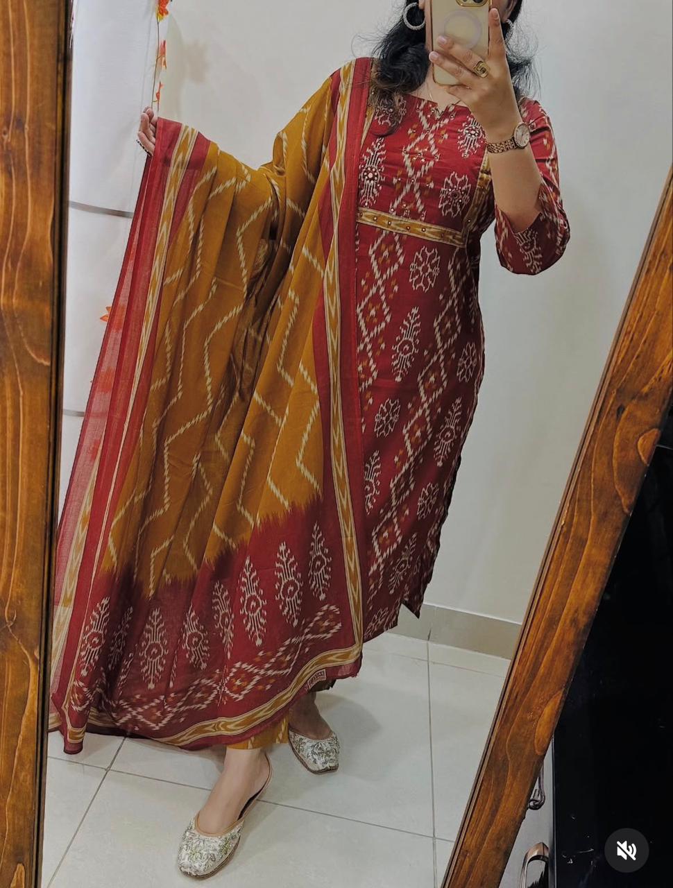 Angrakha Style Cotton Kurti Pant & Dupatta Set for Women